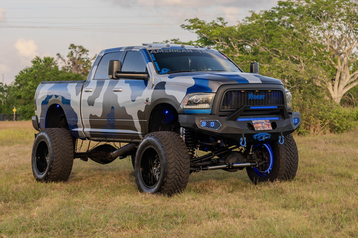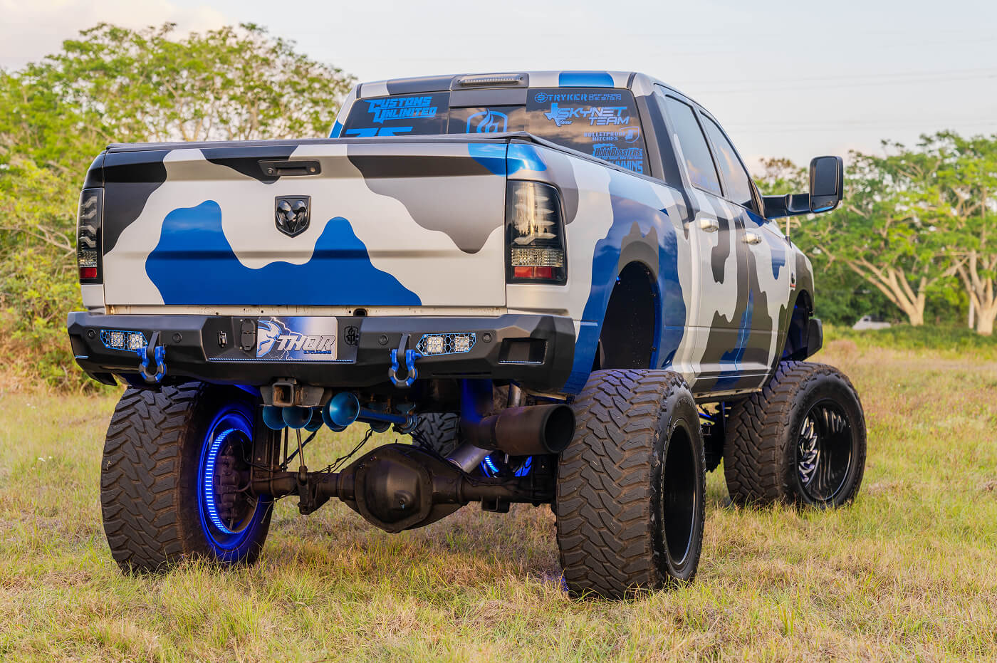 Check out Drew Stewart’s badass 2016 RAM 3500, aka “Thor” (@thor_6.7cummins on IG), rocking our Venom Power Terra Hunter M/T tires in 40X15.50R22LT. This beast features an 8” Stryker Lift with Fox Shocks, KG Forged Wheels, and a hand-laid camo wrap by ZS Motorsports in Arlington, TX. Loaded with Road Armor bumpers, Customs Unlimited lighting, Bulletproof Hitches recovery accessories, and Hornblasters train horns, Thor is a show-stopping custom truck built to turn heads!