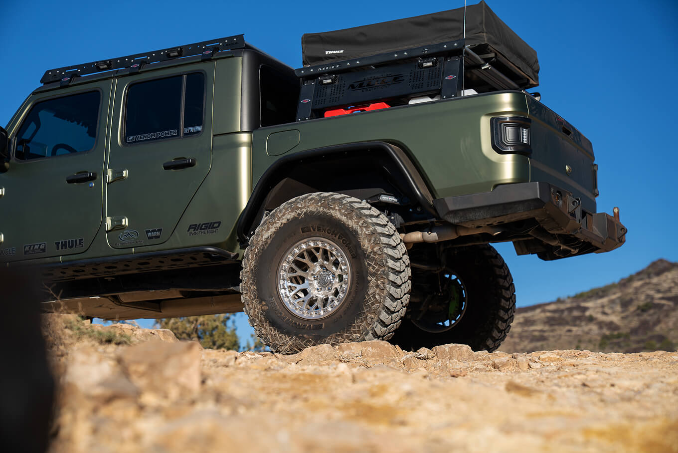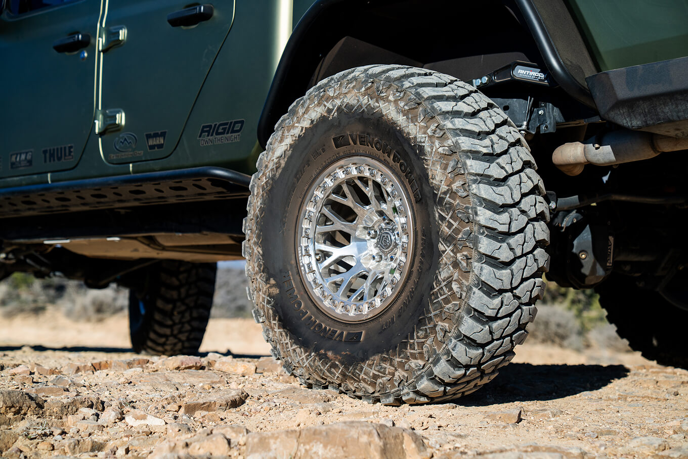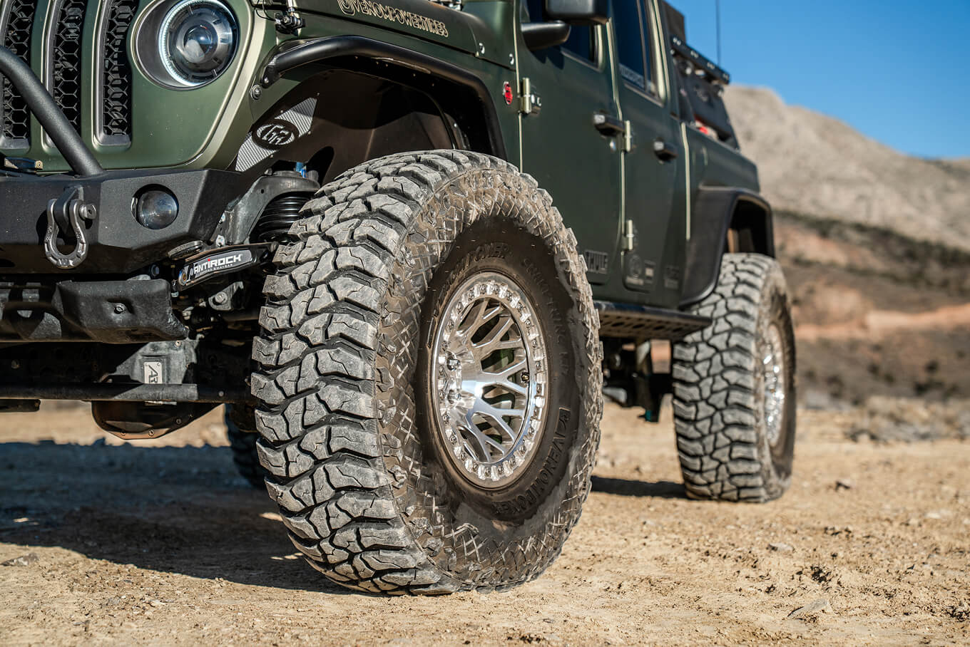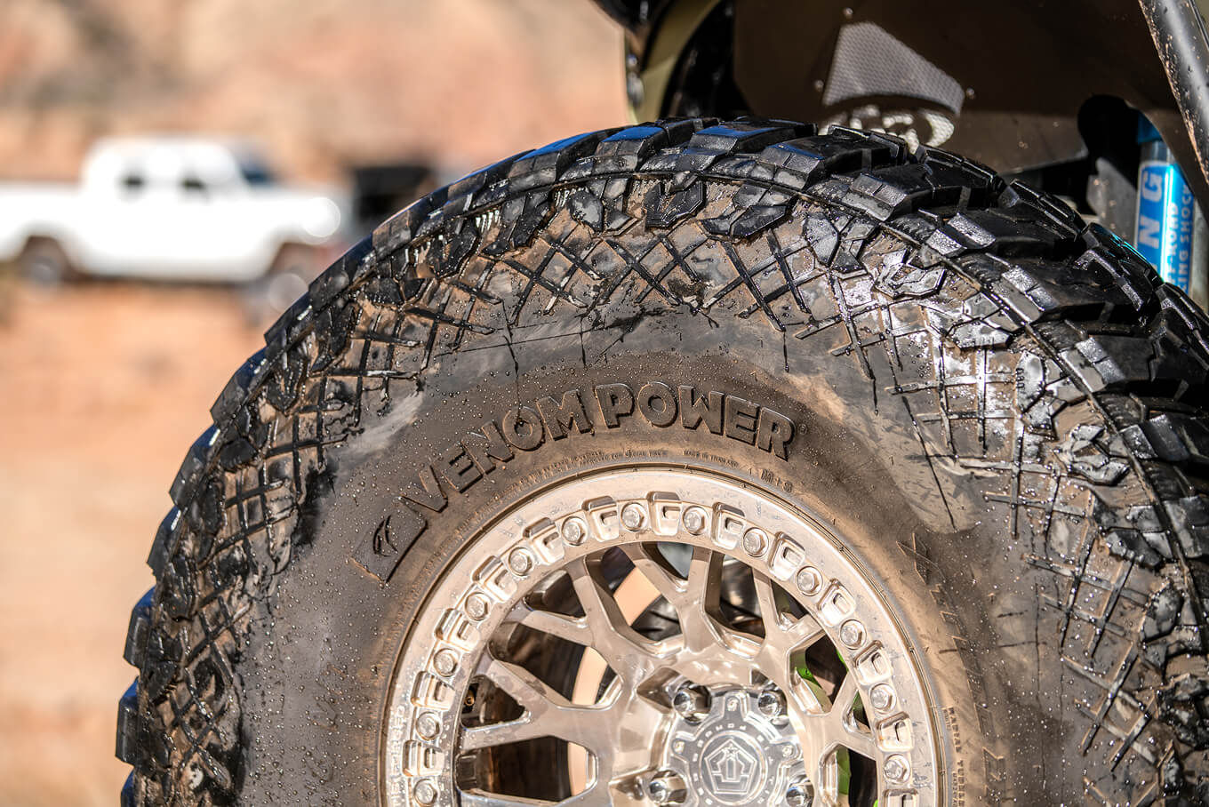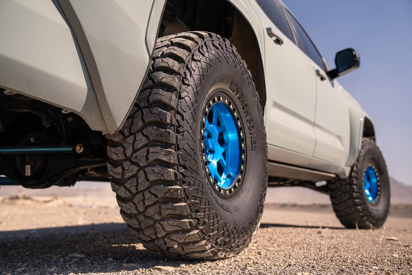 A modern, high-traction mud-terrain tire with striking aesthetics complements its ability to conquer rugged terrain.