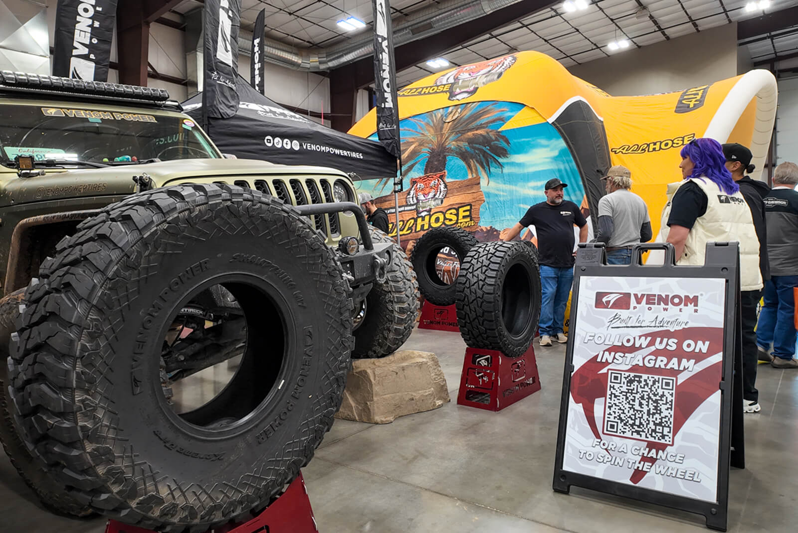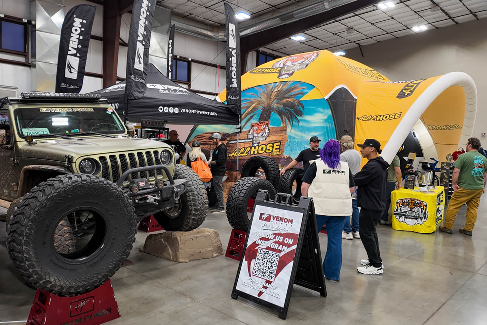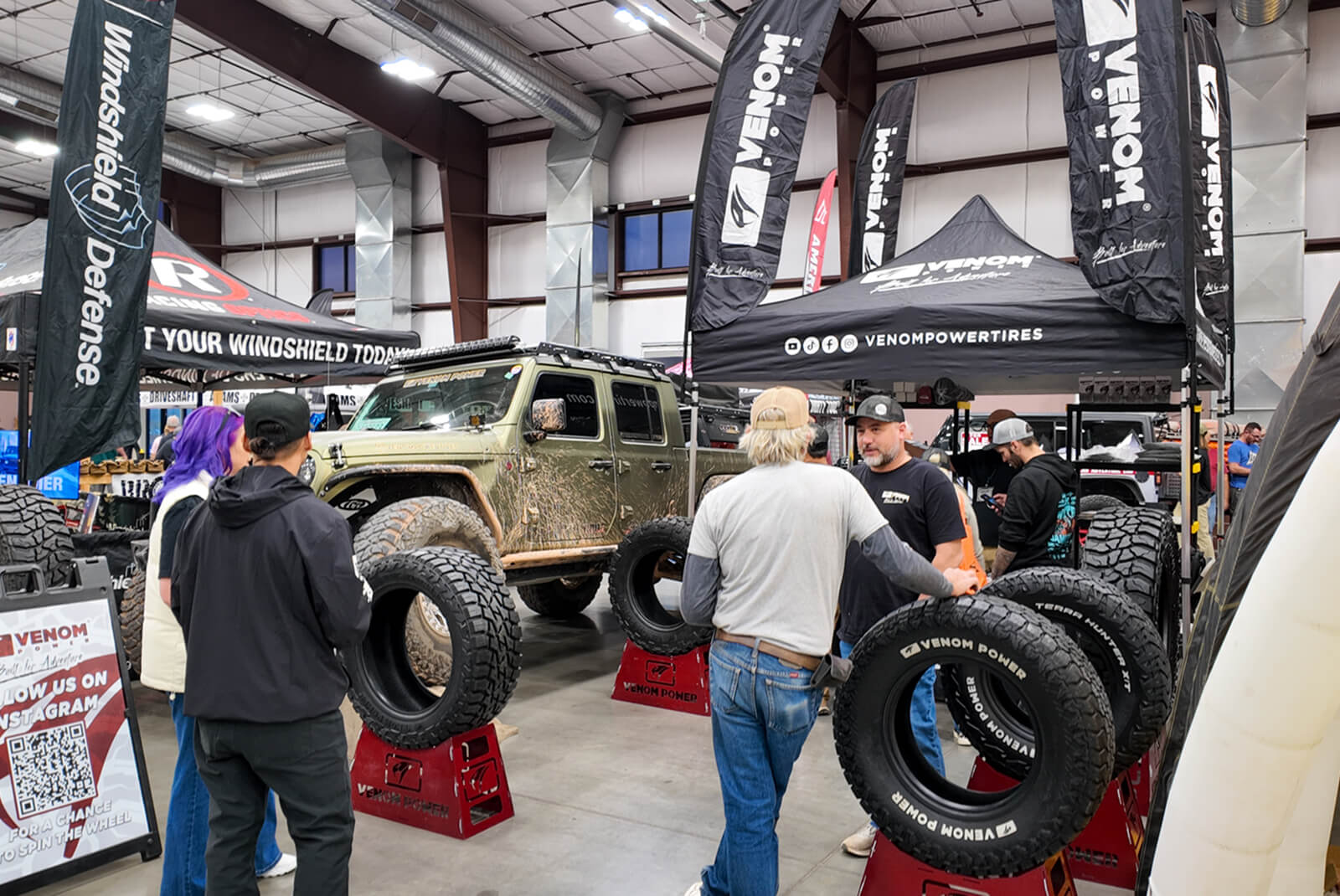 Inside the vendor show, the Venom Power booth showcased the 40" Swampthing M/T alongside our full light-truck lineup, giving attendees a chance to see the tires up close and talk through their builds. For many, it was their first time seeing the Swampthing M/T in a 40-inch fitment mounted on real rigs.