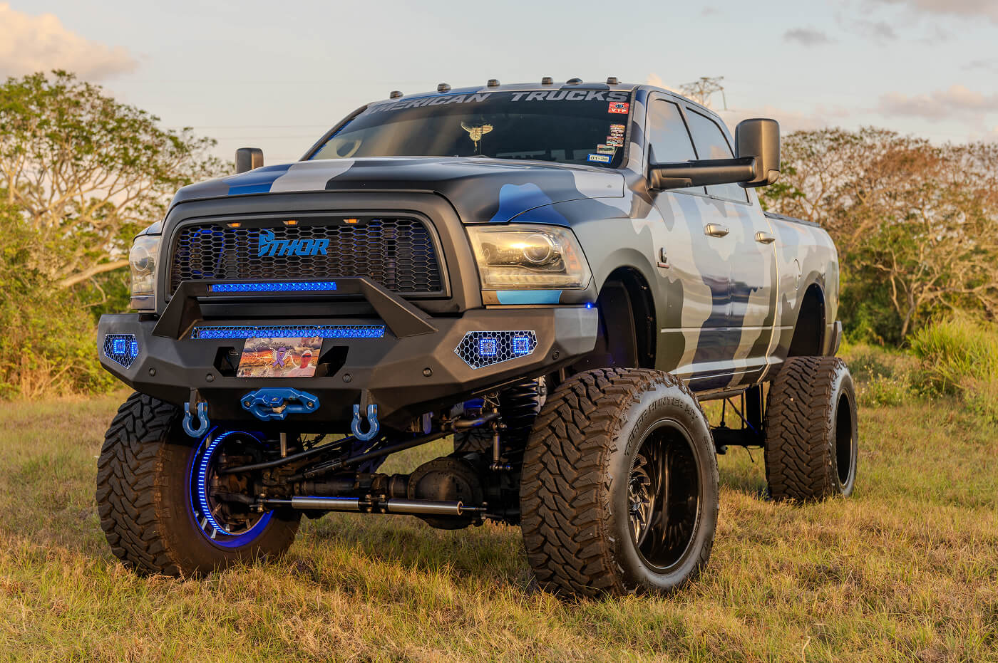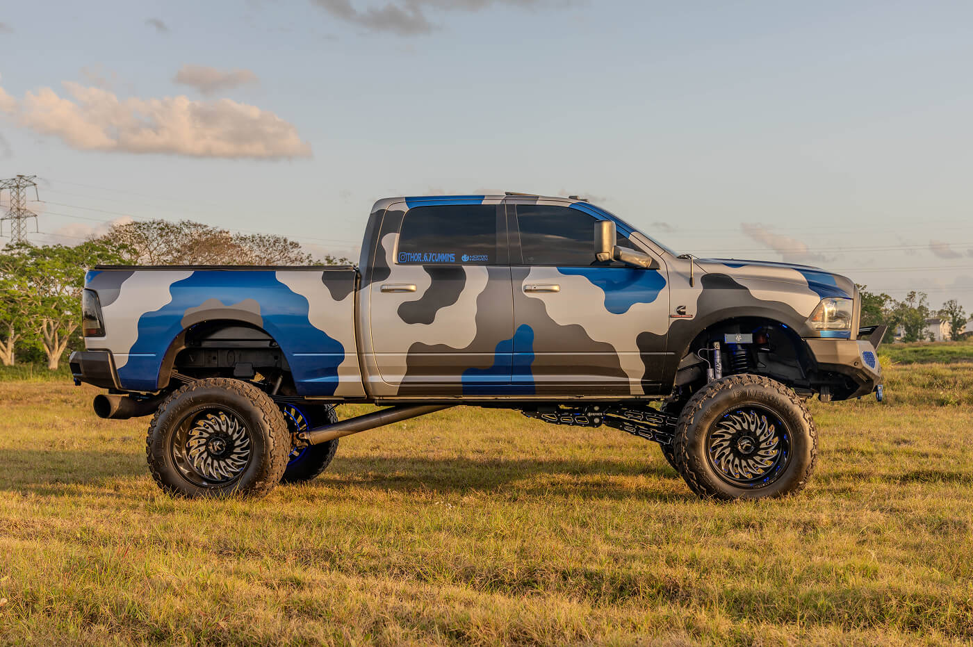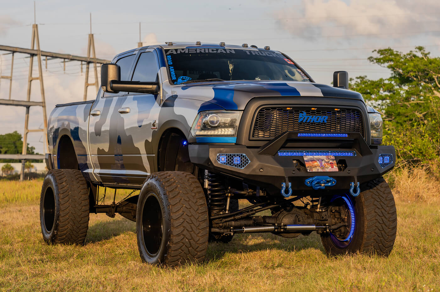 Check out Drew Stewart’s badass 2016 RAM 3500, aka “Thor” (@thor_6.7cummins on IG), rocking our Venom Power Terra Hunter M/T tires in 40X15.50R22LT. This beast features an 8” Stryker Lift with Fox Shocks, KG Forged Wheels, and a hand-laid camo wrap by ZS Motorsports in Arlington, TX. Loaded with Road Armor bumpers, Customs Unlimited lighting, Bulletproof Hitches recovery accessories, and Hornblasters train horns, Thor is a show-stopping custom truck built to turn heads!