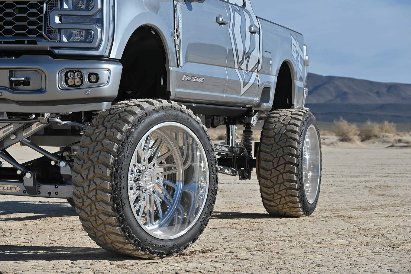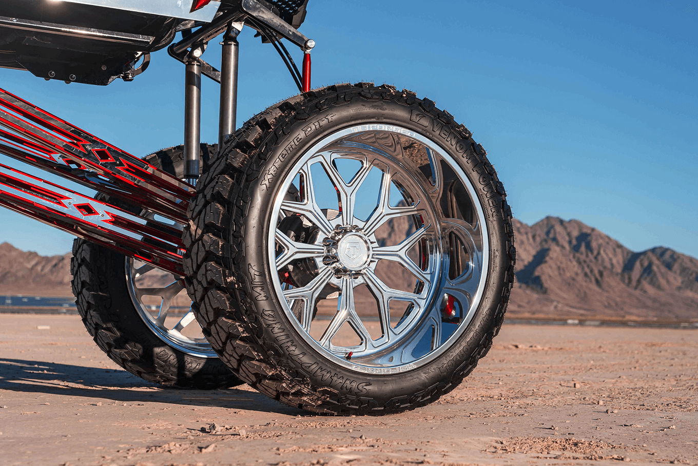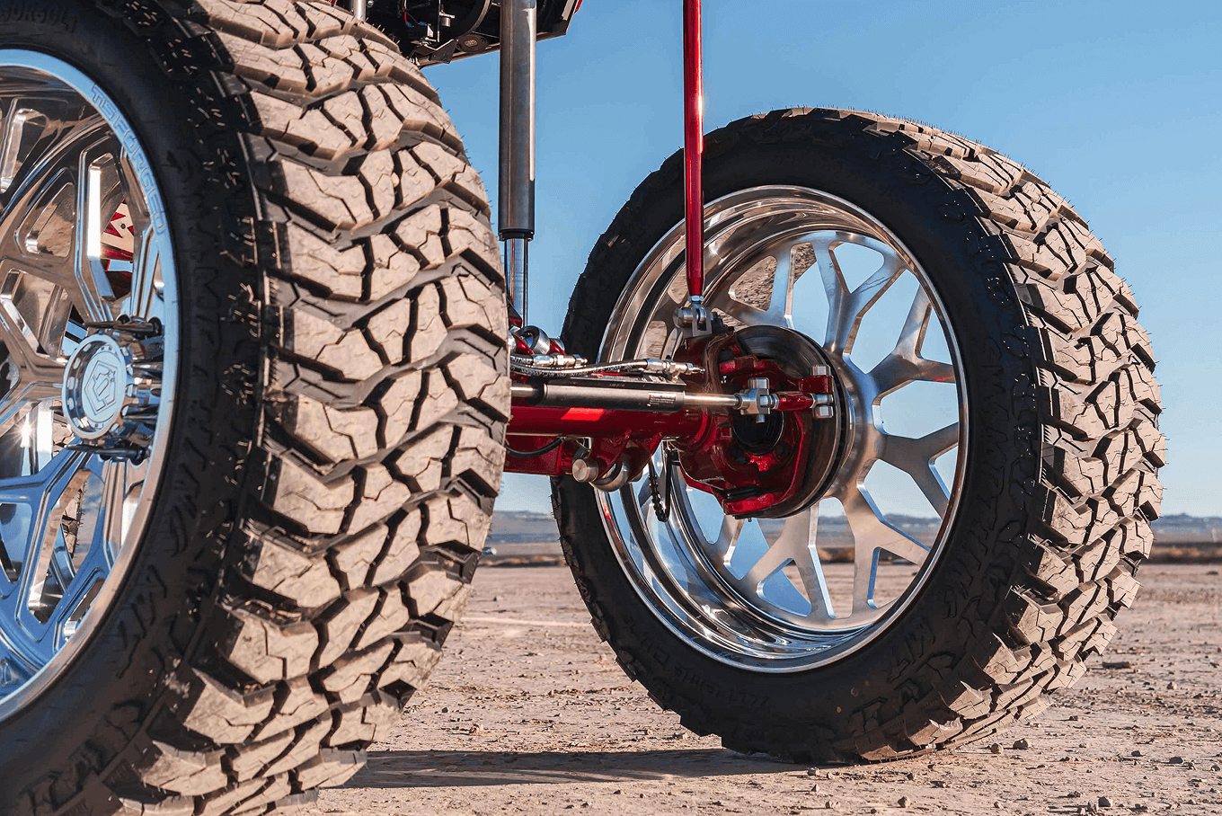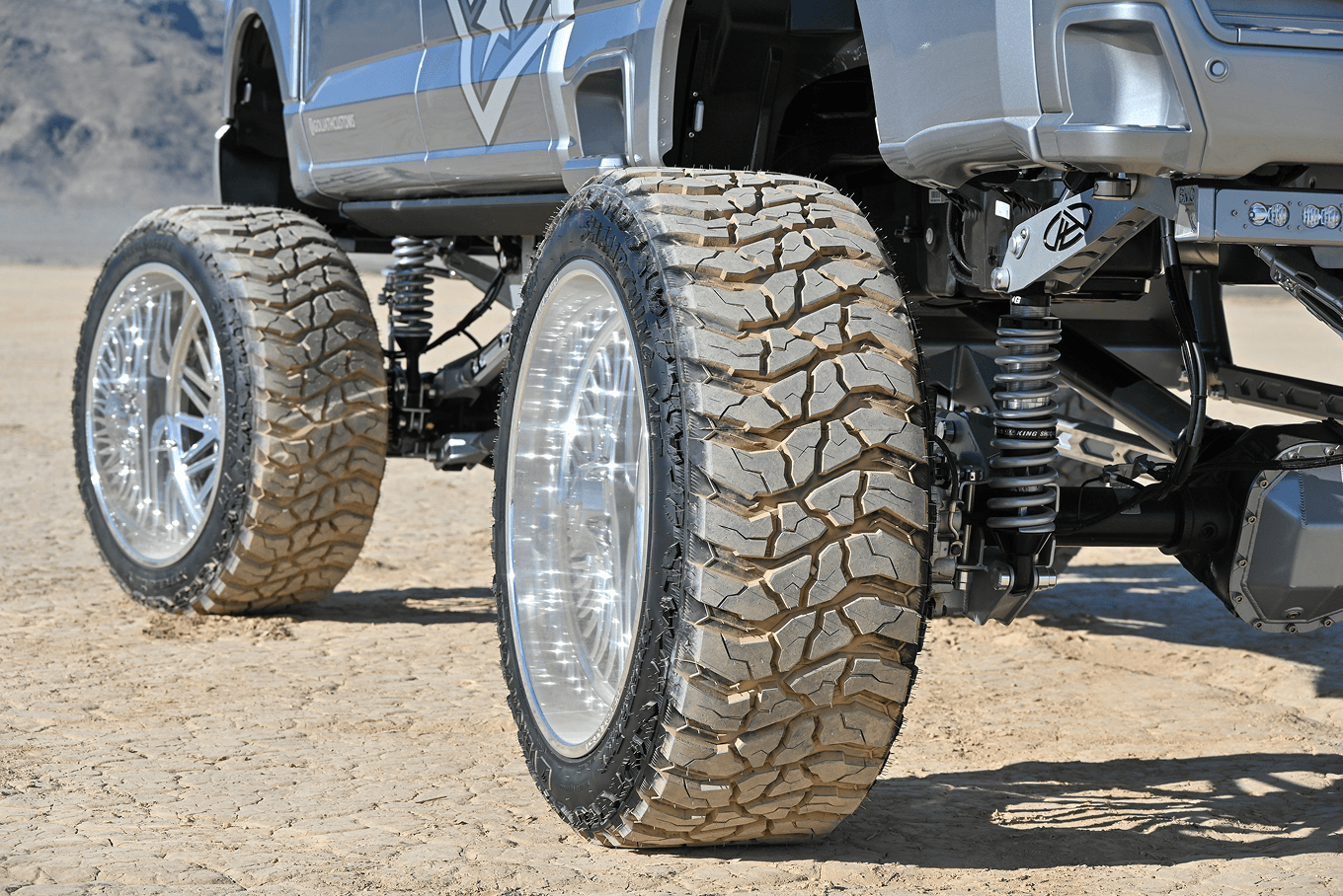 A modern, high-traction mud-terrain tire with striking aesthetics complements its ability to conquer rugged terrain.