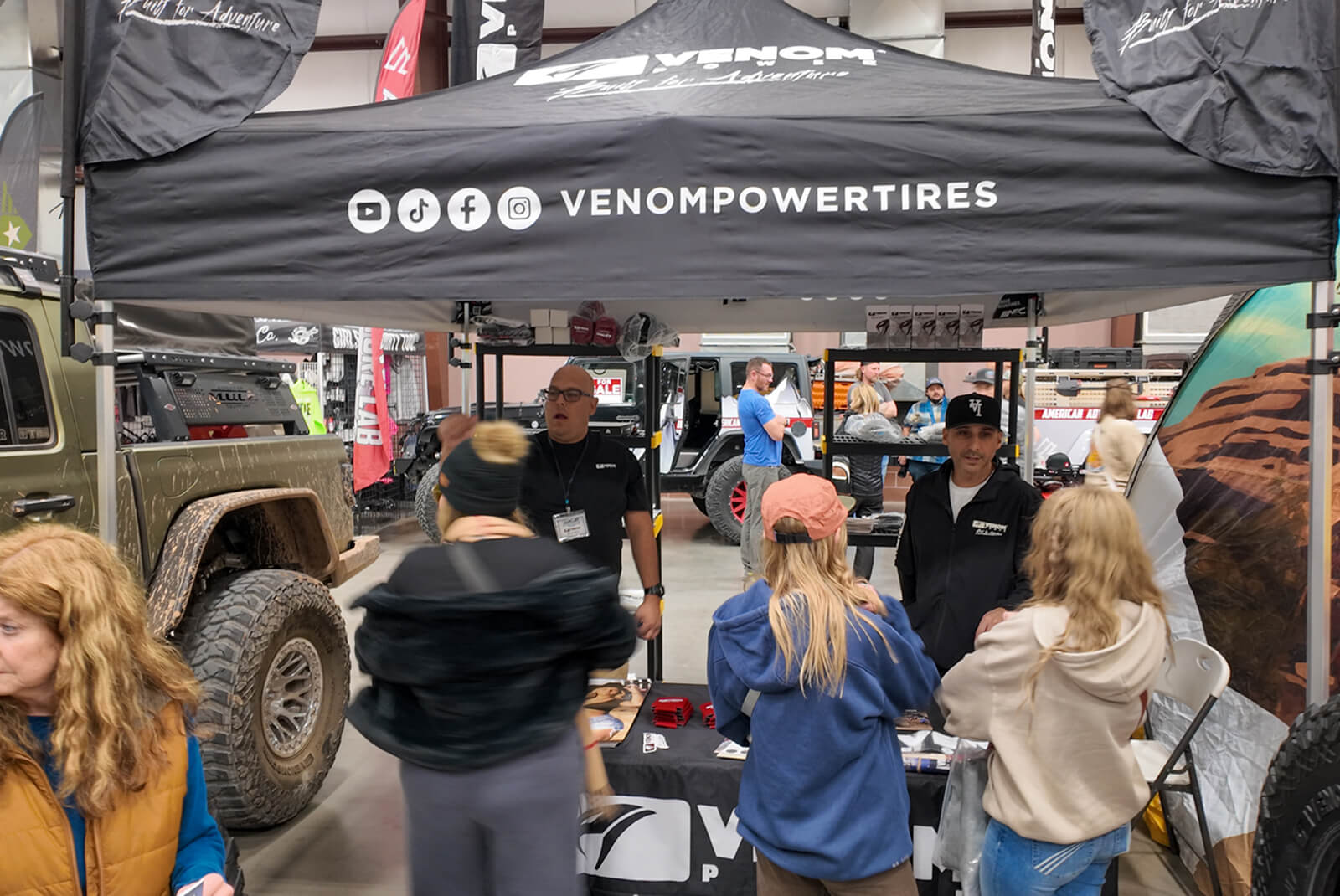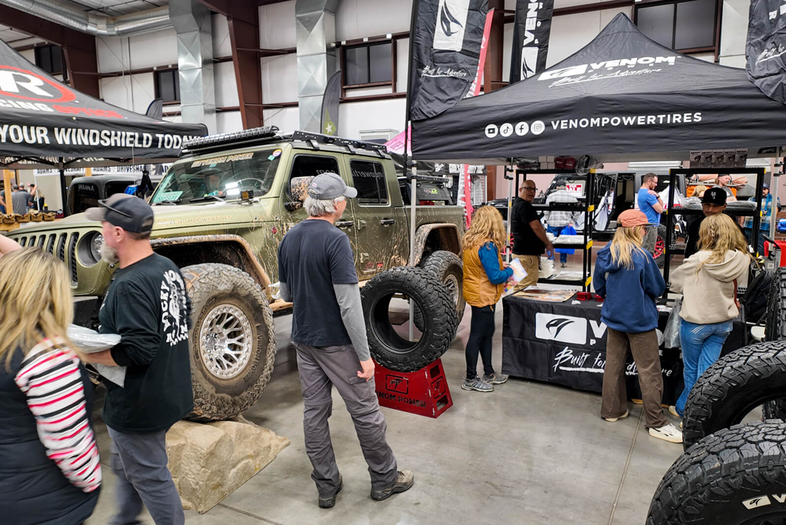 Inside the vendor show, the Venom Power booth showcased the 40" Swampthing M/T alongside our full light-truck lineup, giving attendees a chance to see the tires up close and talk through their builds. For many, it was their first time seeing the Swampthing M/T in a 40-inch fitment mounted on real rigs.